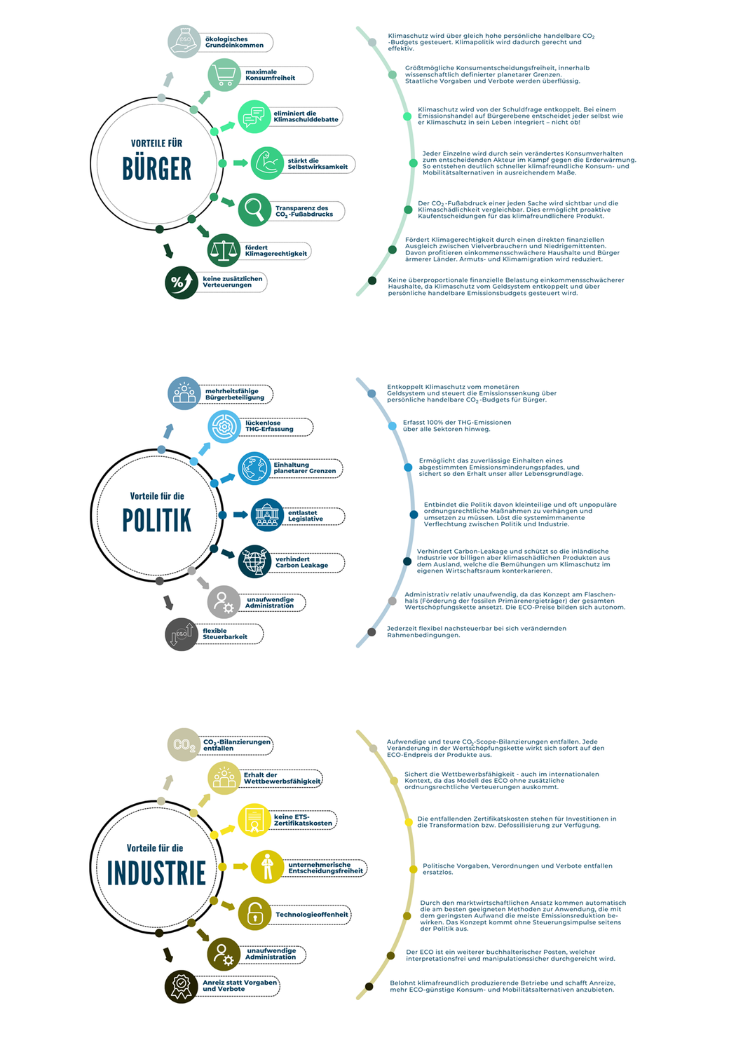 - Personalize: Eine monatliche Pro-Kopf-Zuteilung als „ökologisches Grundeinkommen“ in ECO ist fair und hat deshalb die Chance auf hohe gesamtgesellschaftliche Akzeptanz.